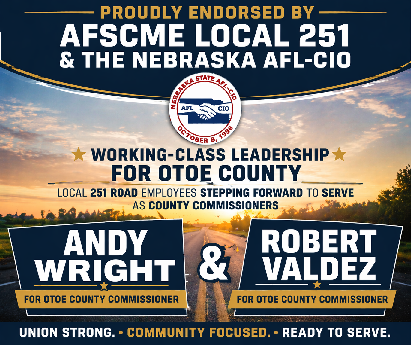 AFSCME Local 251 is proud not only to endorse Andrew Wright and Robert Valdez, but also to have actively advocated on their behalf with leadership at the Nebraska AFL-CIO. We are grateful that our fellow union brothers and sisters across the labor movement recognized the importance of supporting working-class candidates and responded positively to our request for solidarity. Both candidates were included in the Nebraska AFL-CIO’s 2026 primary election endorsements, reflecting broad labor support for their commitment to public service and responsible leadership.